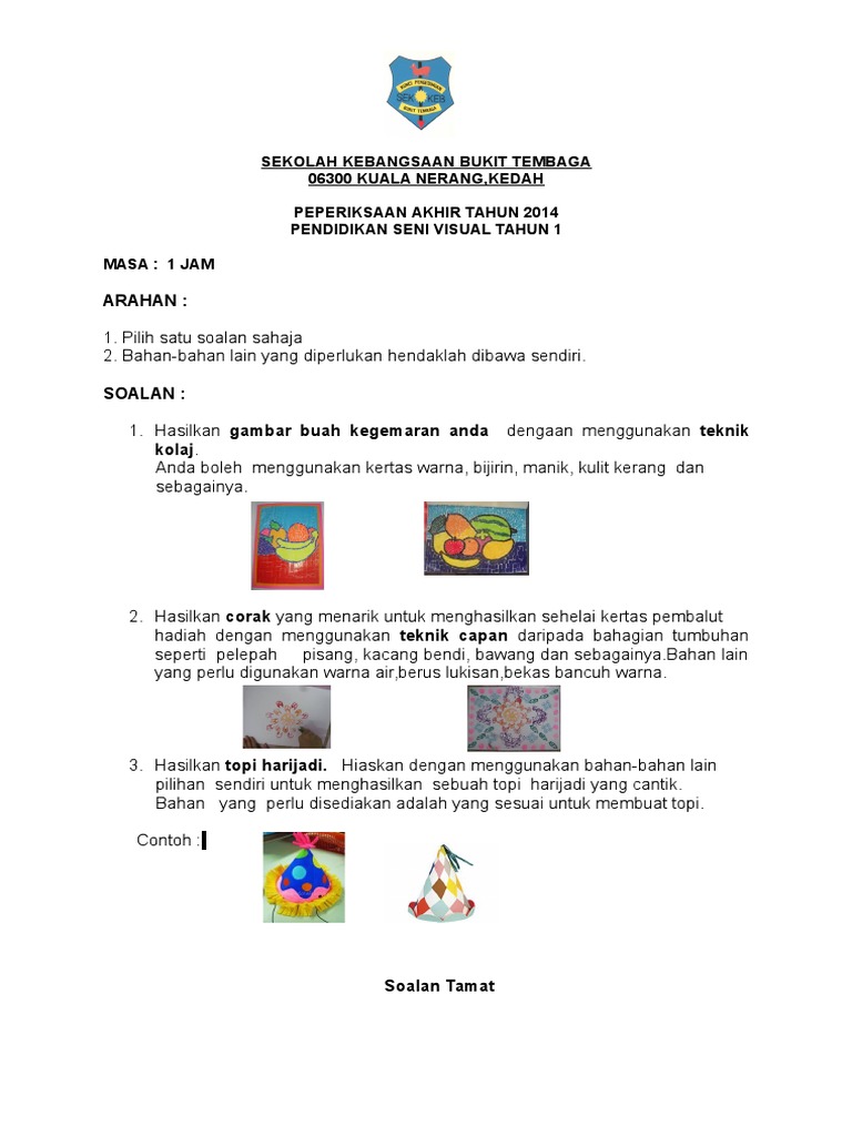Soalan Akhir Tahun Pendidikan Seni Visual Tingkatan 1 adalah antara bahan-bahan terbaik yang kami. Krayon kertas lukisan batang sate atau lidi 2. Pendidikan seni tahun 1 JAWAB SEMUA SOALAN ID.